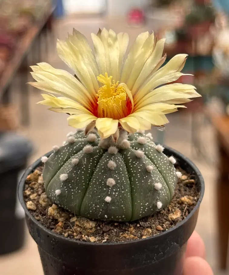 O Astrophytum asterias é uma obra-prima natural. Sem espinhos e com formato simétrico e achatado, lembra uma pequena estrela — e suas flores amarelas com centro alaranjado são um verdadeiro show à parte.