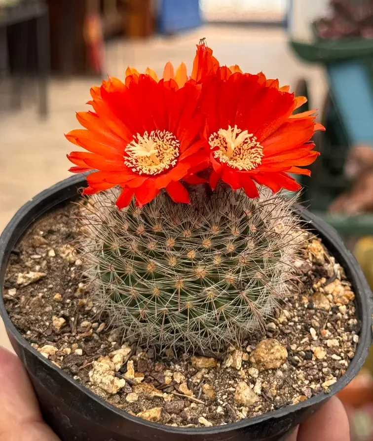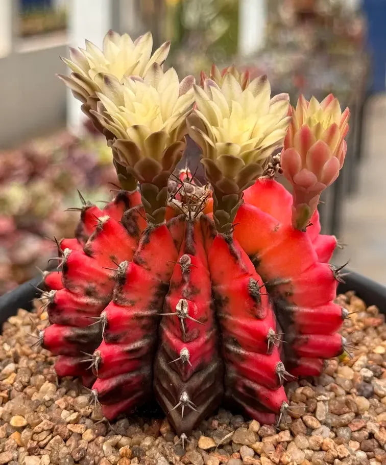De porte pequeno e formato globoso, ela se destaca pelas flores vermelhas brilhantes, que parecem pintadas à mão e surgem em contraste vibrante com o corpo verde-escuro e espinhos dourados.