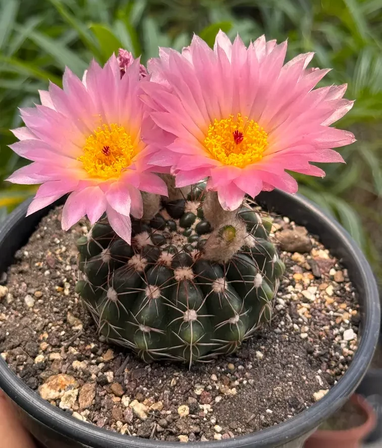 Originário do sul do Brasil, o Notocactus uebelmannianus encanta por sua floração em tons de roxo, rosa e violeta — uma das mais raras entre os cactos.