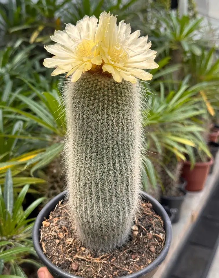 Durante a primavera e o verão, ele presenteia o cultivador com flores amarelas intensas que surgem no topo do caule, formando um contraste belíssimo com o tom claro dos espinhos.